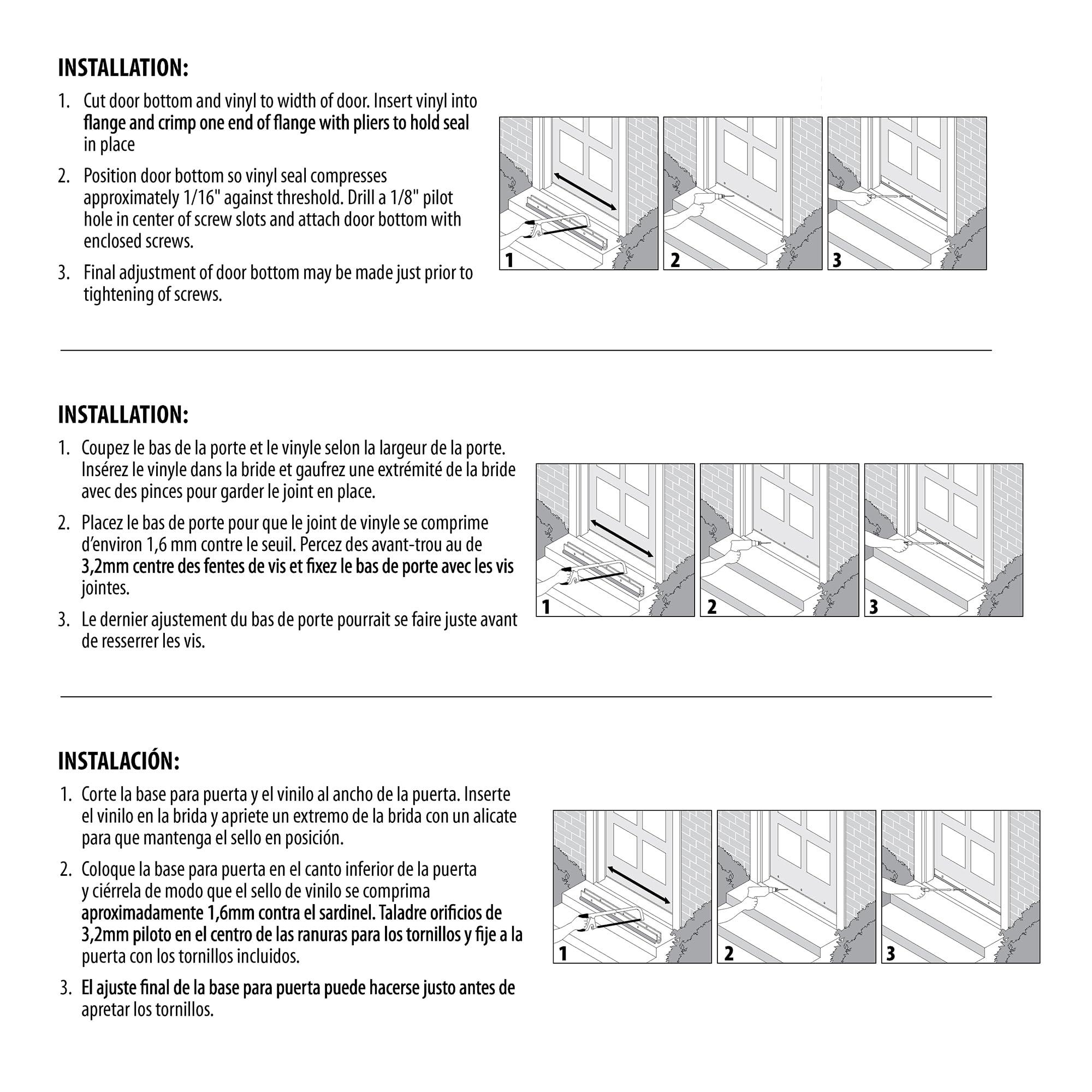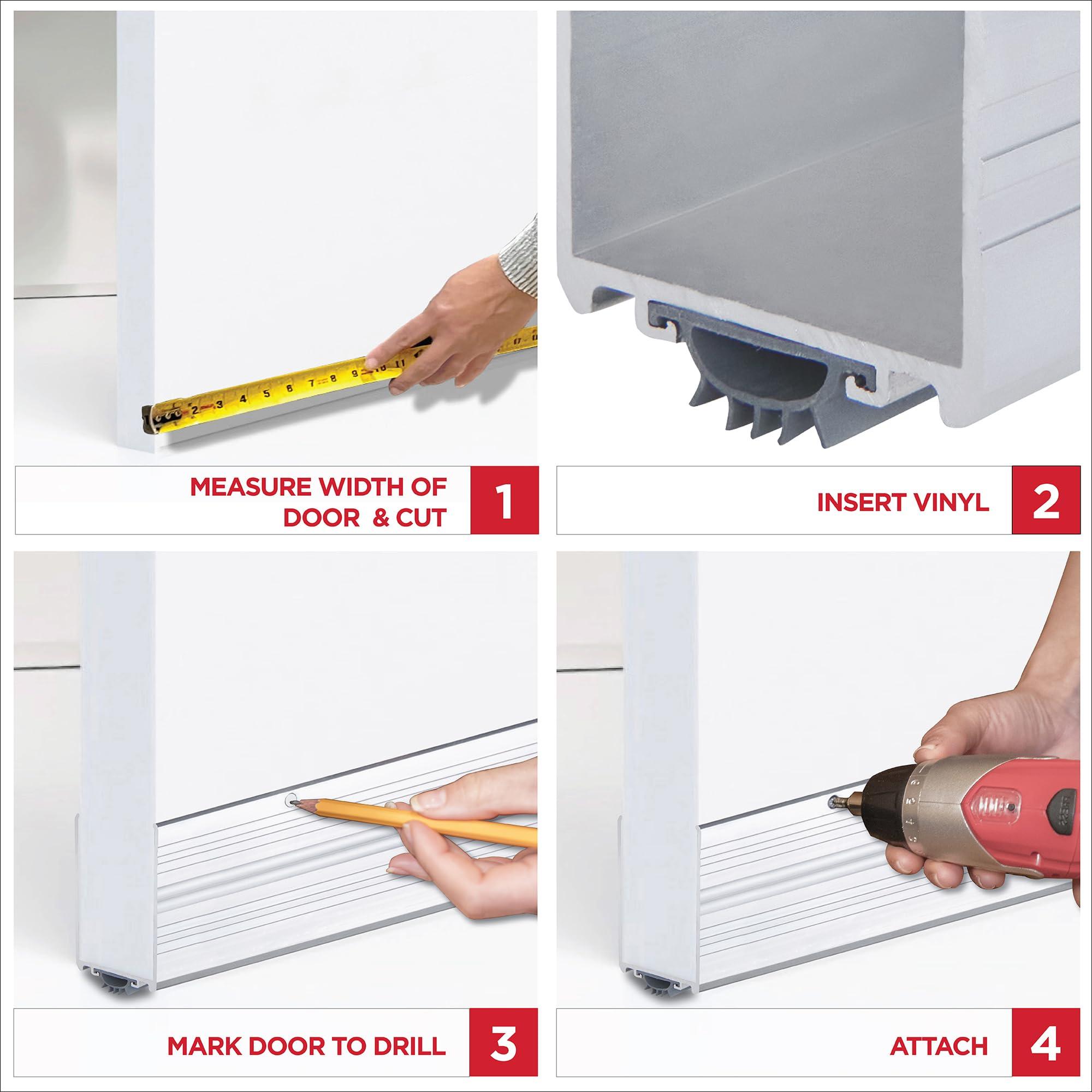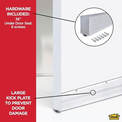 - Comprehensive Door Compatibility: The Aluminum and Vinyl U-Shape Screw-on Under Door Seal with Kick Plate is engineered to fit around a standard 1-3/4 in. thick exterior door, including wood, metal, and fiberglass. Its versatile design ensures the Kick plate protects the door from damage creating a perfect seal for exterior doors, making it an ideal solution for both residential and commercial spaces. By effectively blocking drafts and reducing energy loss, the replaceable vinyl seal enhances indoor comfort, creating a quieter, cleaner, and more energy-efficient environment for any setting.